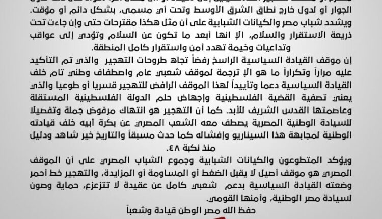 ويشدد شباب مصر والكيانات الشبابية على أن مثل هكذا مقترحات حتى وإن جاءت تحت ذريعة الاستقرار والسلام، الإ انها أبعد ما تكون عن السلام وتؤدي إلى عواقب وتداعيات وخيمة تهدد أمن واستقرار كامل المنطقة.