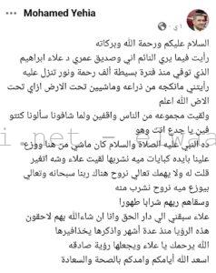 د/”علاء إبراهيم” الذي توفي منذ فترة بسيطة ألف رحمة ونور تنزل عليه.. رأيتني مانكجه من ذراعه وماشيين تحت الأرض إزاي تحت الأرض الله أعلم، ولقيت مجموعة من الناس واقفين ولما شافونا سألونا كنتوا فين يا جدع أنت وهو، ده النبي عليه الصلاة والسلام كان ماشي من هنا ووزع علينا بإيده كبايات ميه نشربها لقيت علاء وشه اتغير، قلت له ولا يهمك تعالى نروح هناك ربنا سبحانه وتعالى بيوزع ميه نروح نشرب منه.. وسقاهم ربهم شرابا طهورا، علاء سبقنى إلى دار الحق وأنا إن شاء الله بهم لاحقون، هذه الرؤيا منذ عدة أشهر وأذكرها يخذافيرها، الله يرحمك يا علاء ويجعلها رؤية صادقة.. أسعد الله أيامكم وأمدكم بالصحة والسعادة”.