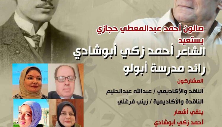 ينظم بيت الشعر العربي (مركز إبداع الست وسيلة) خلف الجامع الأزهر، التابع لصندوق التنمية الثقافية، أمسية جديدة من أمسيات صالون الشاعر الكبير أحمد عبد المعطى حجازى تحمل إسم الشاعر “أحمد زكى أبو شادى” رائد مدرسة “أبولو”، وذلك في السادسة مساء غداً (الأحد 16 فبراير) .